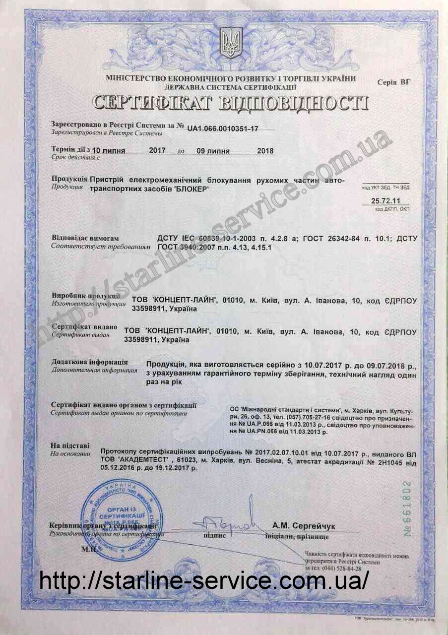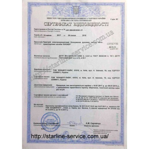 Сертификат Автомобильной противоугонной системы Снайпер (Блокер)